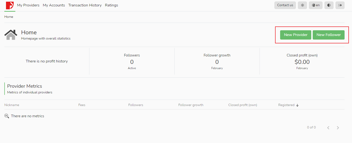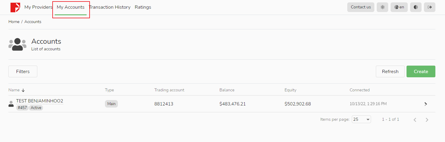 في صفحة المتابع [حسابي] ، يمكنك إضافة حساب تداول جديد بالنقر فوق الزر الأخضر [إنشاء]. ومع ذلك ، لا يمكن استخدام هذا الحساب لتسجيل الدخول ، ويمكن اختياره فقط كمصدر إشارة أو متابع أو إعداد لتلقي رسوم الأداء.