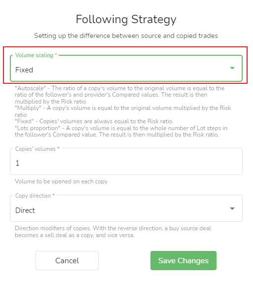 يعتمد حجم تداول النسخ على الرصيد الحالي أو حقوق الملكية لحساب التابع. يمكن للمتابعين تعديل حجم تداول النسخ وفقًا لرصيد الحساب الجاري أو صافي القيمة للتحكم في مخاطر النسخ