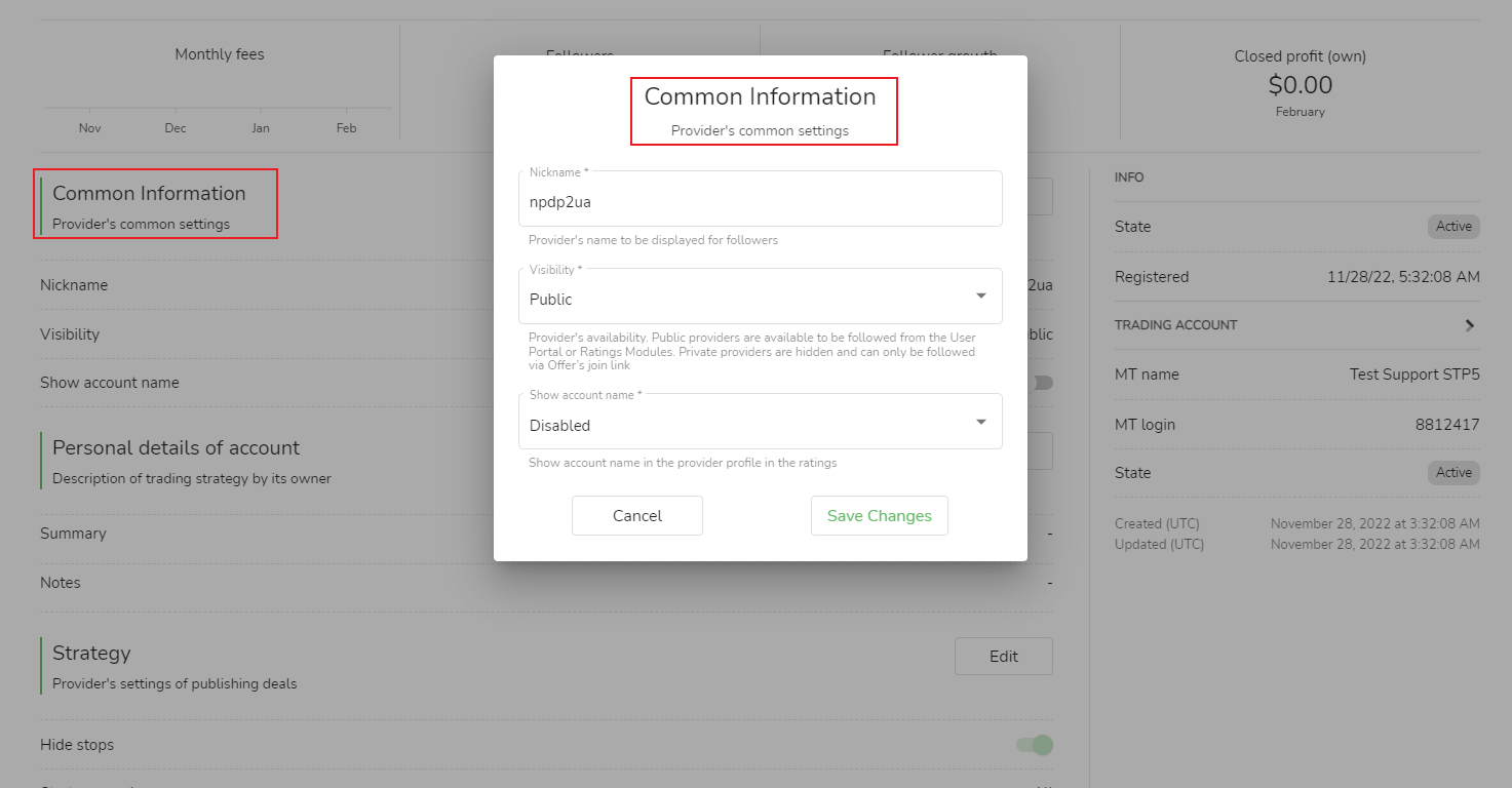 حساب قبول رسوم الأداء:حساب التداول الذي يجمعه مصدر الإشارة المتابعين لدفع رسوم الأداء لمصدر الإشارة يمكنه اختيار حساب موجود أو إضافة حساب جديد.في عملية إضافة حساب جديد ، تحتاج إلى ملء حساب التداول (أي ، حساب التداول في MetaTrader) وكلمة المرور (أي كلمة مرور معاملة MetaTrader) ثم انقر فوق [حفظ التغييرات] لإكمال الإعدادات بنجاح.