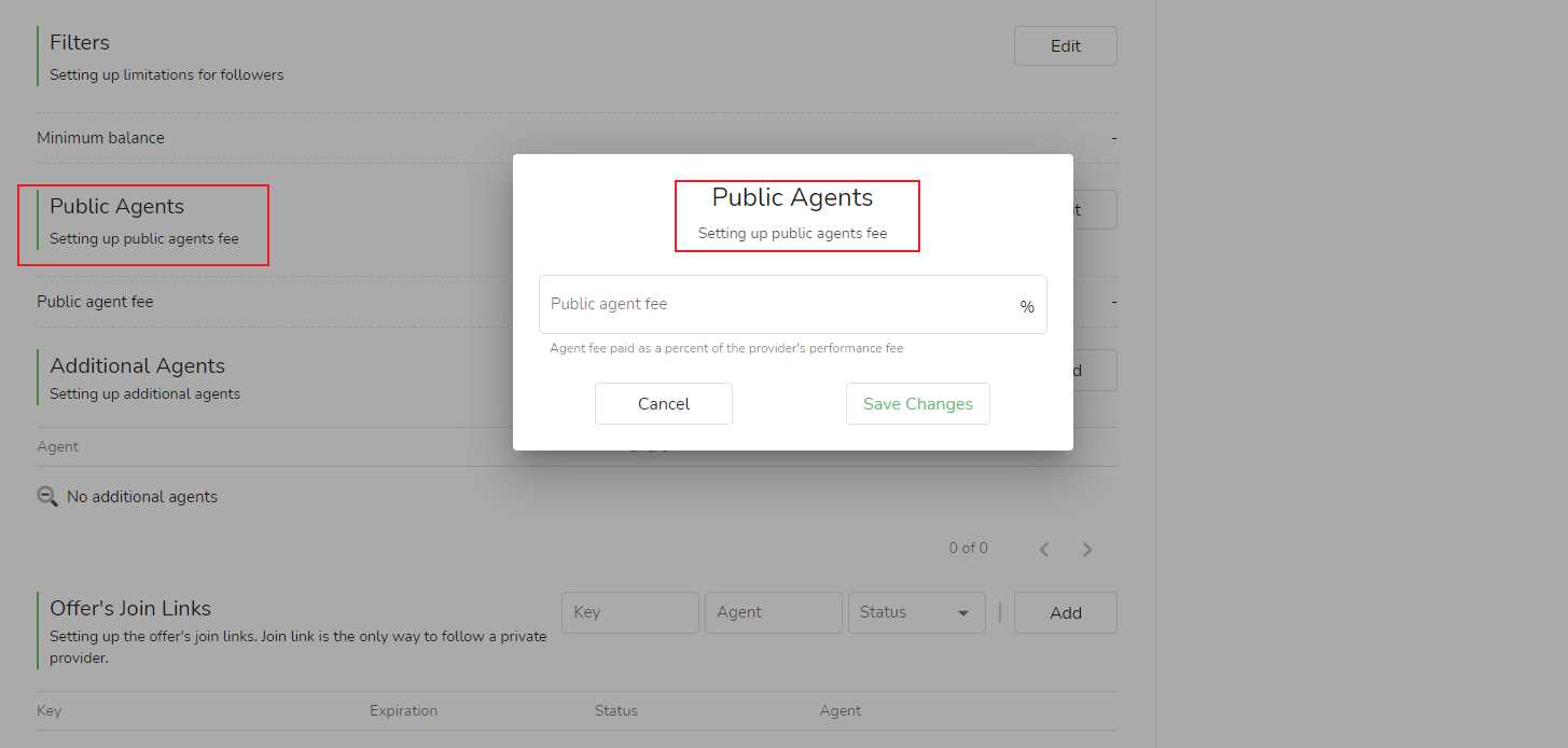 Presentar y promover:La fuente de la señal puede establecer una tarifa de presentación y promoción, que se paga en forma de porcentaje. Tenga en cuenta que el enlace de unión de la fuente de señal a continuación solo se puede agregar después de completar la configuración de la tasa de pago de la tarifa de promoción específica.