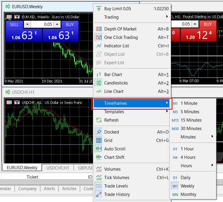 Haga clic derecho en [Gráfico] en la barra de menú de MT5 y seleccione [Período] para ver todos los períodos de tiempo que se pueden seleccionar en MT5.