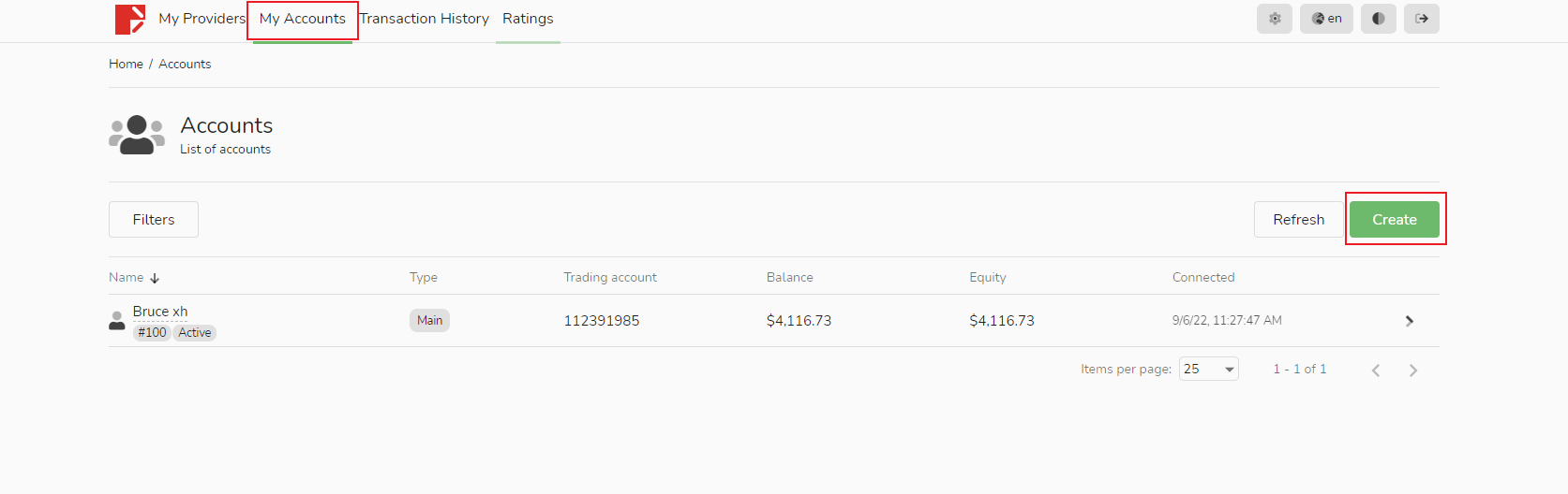 1. CopyTrading에 로그인하고 "내 계정" 열에서 오른쪽에 있는 녹색 버튼 "만들기"를 클릭하십시오.