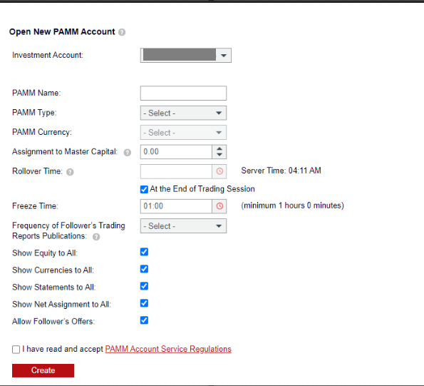 d. 새 PAMM 계정에 대해 다음 세부 정보를 입력하고 만들기를 클릭합니다. 이용약관을 꼭 읽어보시고 동의하는 박스에 체크해 주세요.