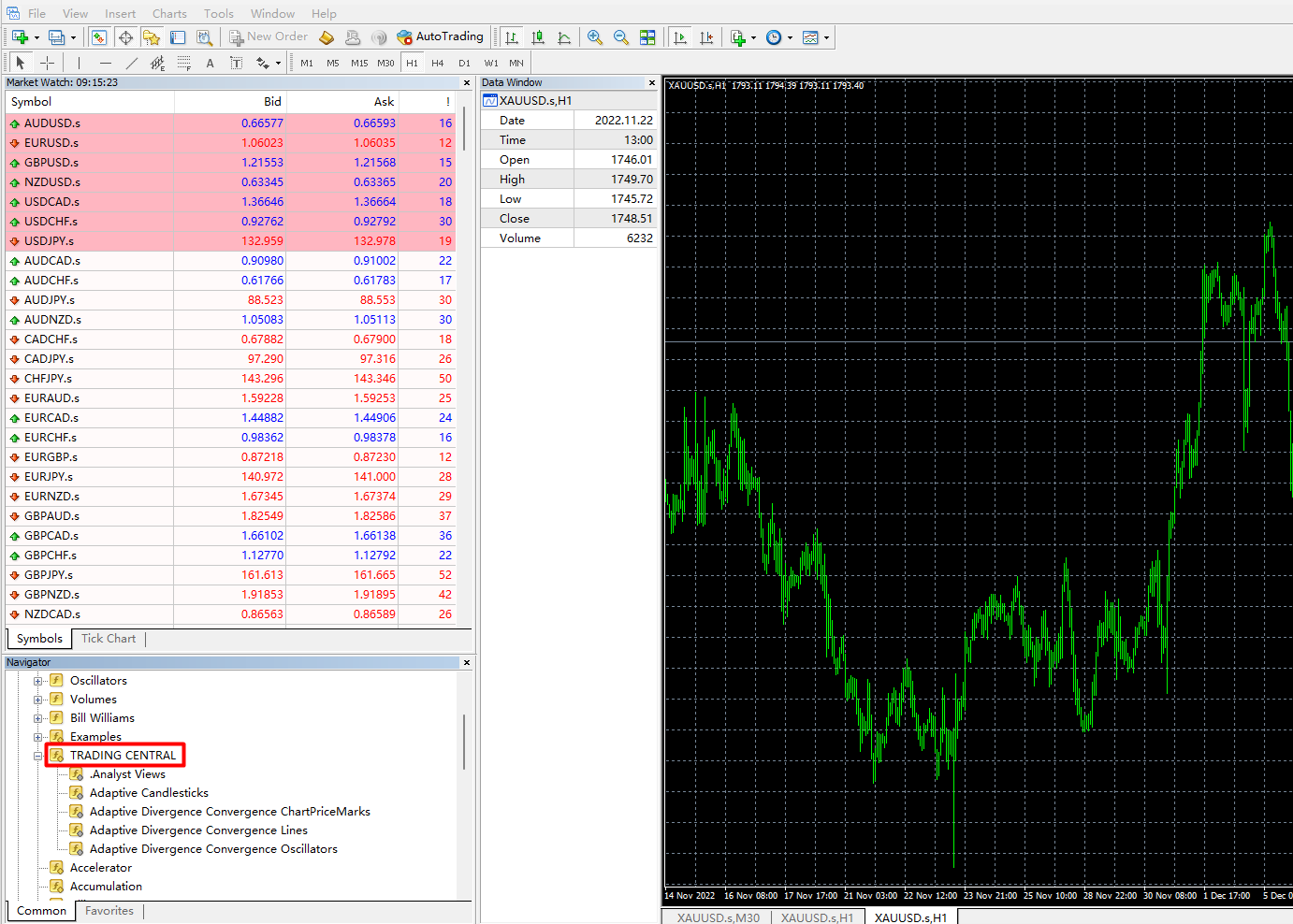 6. MT4 클라이언트를 다시 시작한 후 왼쪽 탐색 모음에서 "기술 지표"를 클릭하고 "Trading Central"을 선택한 다음 모든 지표를 찾아보십시오.