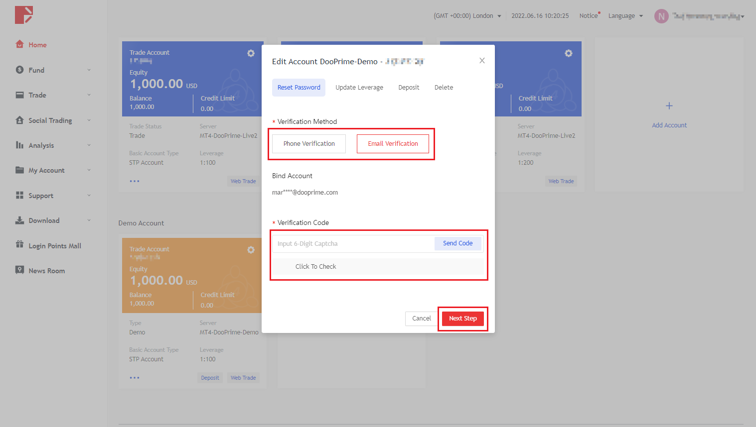 2. Clique em "Redefinir senha", escolha "Verificação móvel" ou "Verificação de e-mail", clique em Verificar e clique em "Avançar" após receber o código de verificação.