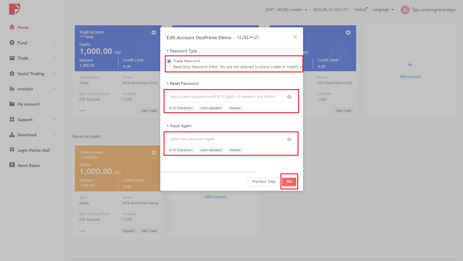3. Selecione o tipo de senha que você precisa redefinir, redefina uma nova senha com uma combinação de 8 a 15 dígitos e letras, digite a nova senha novamente e pressione OK. Depois de redefinir a senha, você precisa verificar por e-mail ou celular e, em seguida, pode ativar a nova senha.