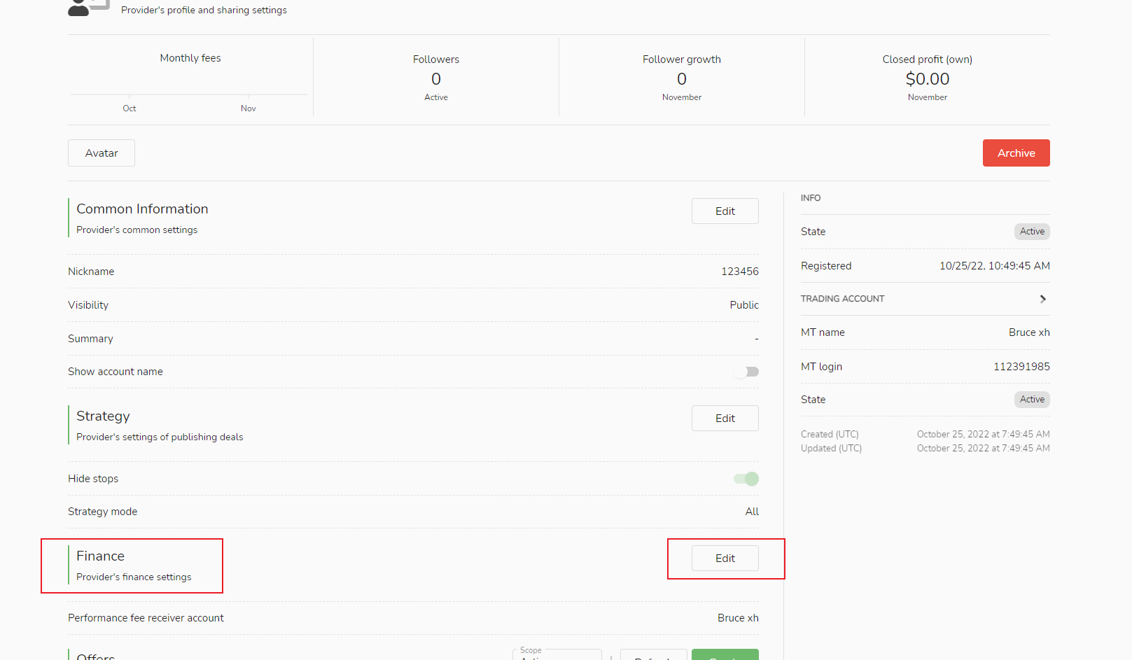 - Na coluna "My Signal Sources", selecione "Performance Fee Receiver Account Settings" e clique no botão "Edit".