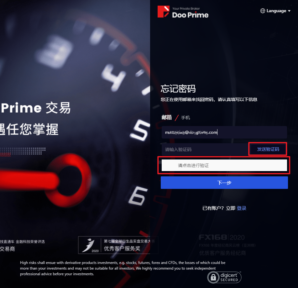 2. 选择以邮箱或手机形式进行验证,输入相关资料后,点击「发送验证码」,输入邮箱或手机收到的验证码后,点击「下一步」。