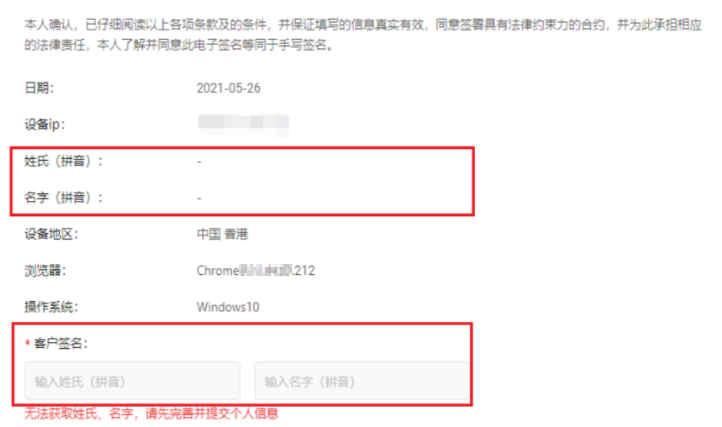 請詳閱客戶協議書(Client Agreement)以及風險確認與披露(Risk Acknowledgement And Disclosure)各項條款及細則,並確保填寫的信息真實有效後,再次在「客戶簽名」中輸入您的姓氏及名字(拼音),以表示您同意簽署此項具有法律約束力的合約,然後點擊「確定」。