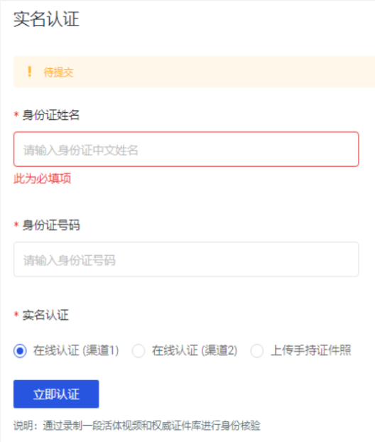如果您是中國地區客戶,則需要進行實名認證。您需填寫身份證上的姓名、身份證號碼,並選擇認證方式,包括在線認證或上傳手持證件照,然後點擊「立即認證」。其他國家或地區的客戶則無需進行實名認證。