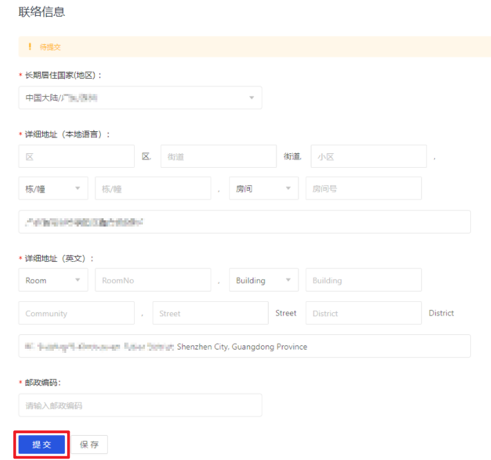 填寫長期居住國家或地區和詳細地址,點擊「提交」。