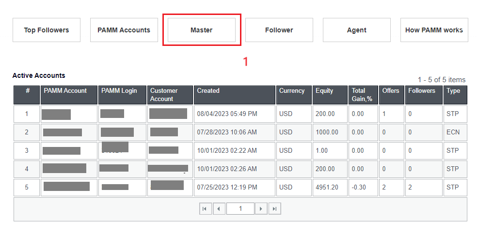 b. 當新的PAMM 帳戶成功建立時,使用者將在「大師」頁面的「活躍帳戶」部分看到已建立的帳戶。